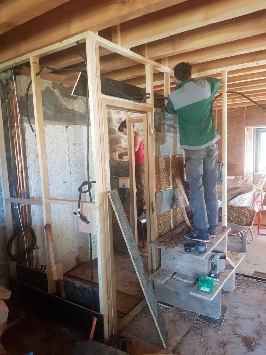 - construction des cloisons intérieures en terre allégée sur ossature bois (juin à août 2022)