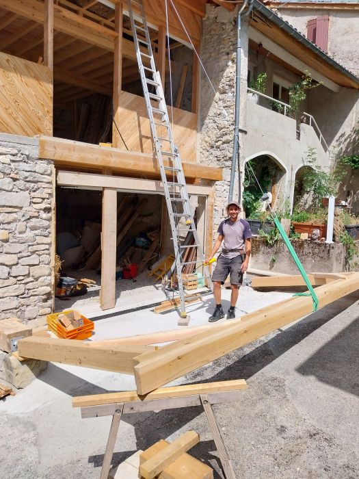 Rénovation totale d’une grange en maison d’habitation, environ 100m2 de murs en pierres remplacés par une ossature bois isolée en bottes de paille du champ d'à côté…