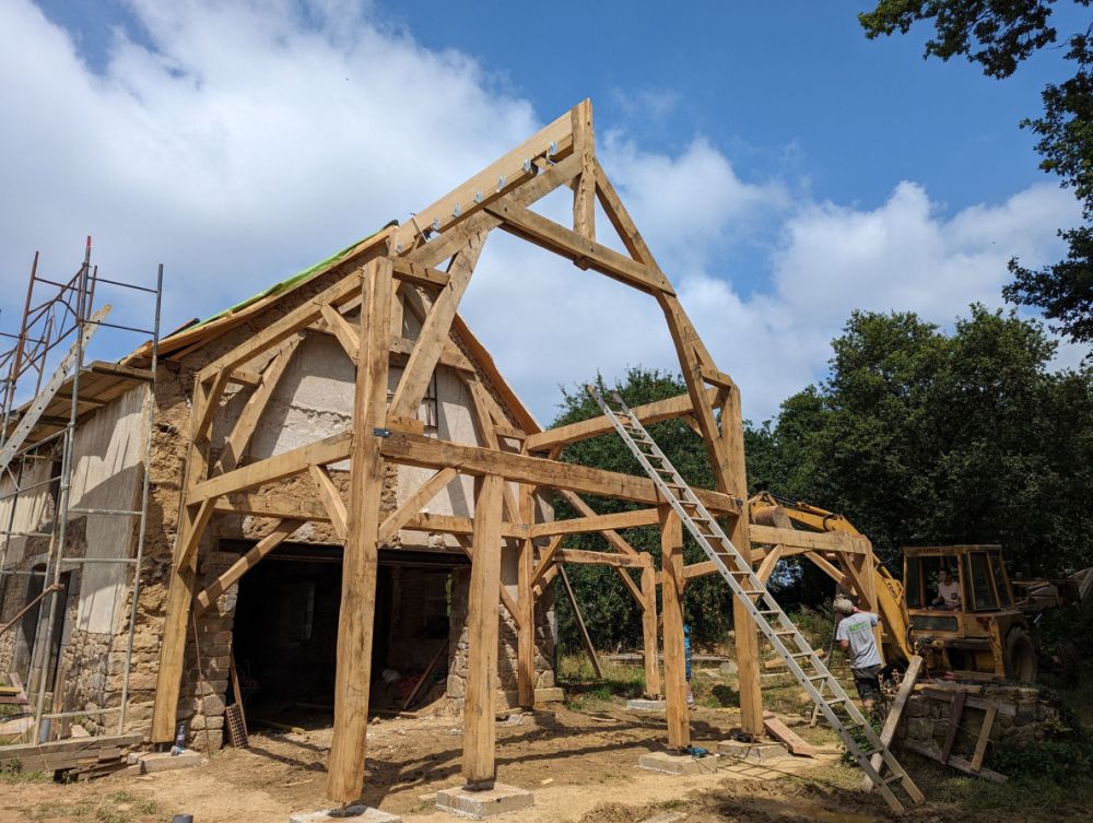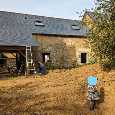 Nous sommes 4 couples de trentenaires et 7 enfants ayant fait l'acquisition d'un hameau dans le cadre d'un habitat partagé. L'équipe est composée (entre autres) d'un maçon du bâti ancien novice et d'un charpentier, très orientés récup, techniques anciennes et eco construction. Les autres profession : psychologue, orthophoniste, sage femme, éditeur, formatrice ergothérapie, animatrice numérique.