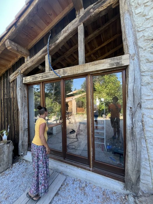 Piquage puis réfection des enduits extérieurs en chaux-sable et intérieur isolé en terre-chanvre.