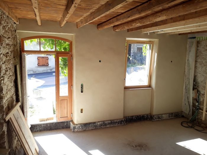 Nous rénovons cette année les 2/3 de la maison (partie principale sur 2 niveaux, située d'un côté du mur de refend). Travaux déjà réalisés : nous avons mis à nu 2 grandes pièces superposées de 50m². Pour cela, l'année dernière nous avons démonté un mur intérieur en pierre, remplacé par 2 grosses poutres en chêne taillées à la main pour la reprise des solives. Les pierres sont en partie réutilisées pour des soutènements en pierre sèche dans le jardin. Ce printemps, nous avons décaissé le sol de 50cm pour réaliser une dalle chaux sur hérisson ventilé au rez-de-chaussée. Nous avons également piqué les enduits plâtre existant sur tous les murs pour repartir de la base. Et d'ici le mois de juillet, nous aurons isolé le mur Nord en panneaux de laine de bois, et les menuiseries auront été changées.