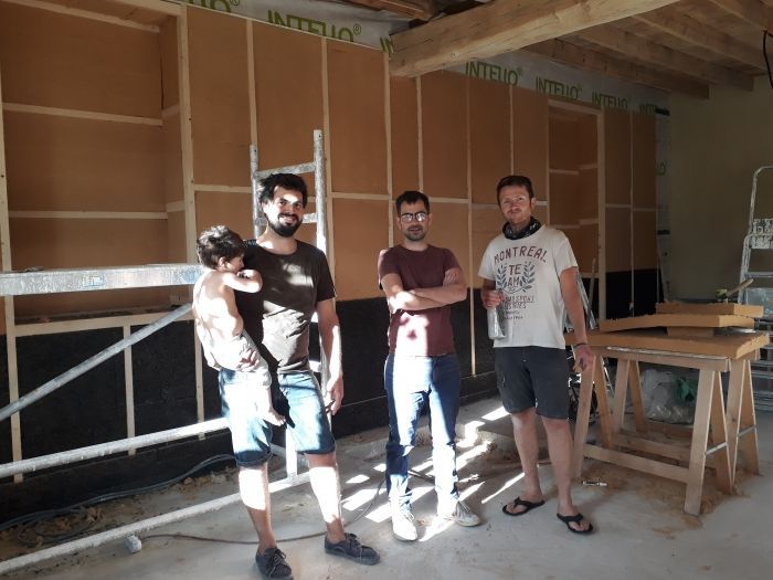 Les chantiers participatifs en juillet et août 2019 nous ont permis de réaliser les enduits intérieurs chaux-chanvre. Sur les murs Est et Ouest, ces enduits ont été appliqués sur une épaisseur de 5cm pour une correction thermique.