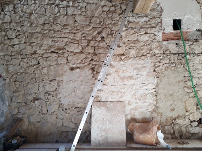 Pour terminer la finition sur les murs, nous rejointoierons prochainement les pierres du mur de refend (au Sud) pour un aspect fini en pierre apparentes (aspect décoratif).