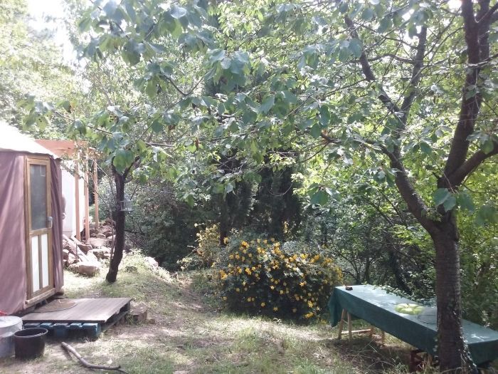 Sur les lieux, il y a des toilettes sèches, deux panneaux solaires pour un peu d'électricité, de l'eau potable, un four à pain au feu de bois, un rocket stove pour cuisiner, une cuisine extérieure avec un petit camping gaz, 4 ruches et un petit poulailler. Le terrain fait 5000 m2.