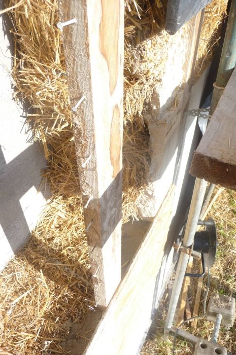 Le chantier global a bien avancé, notamment grâce à l'intervention de différentes entreprises (maçonnerie, menuiserie, etc.). Du côté "auto construction", pour la partie isolation, le chantier avance de bon train, mais il reste encore pas mal de travail. En effet, à ce jour l'ensemble de l'ossature bois est finalisée à 95 % mais seulement 1/3 du remplissage paille et du coulage du mortier est réalisé.