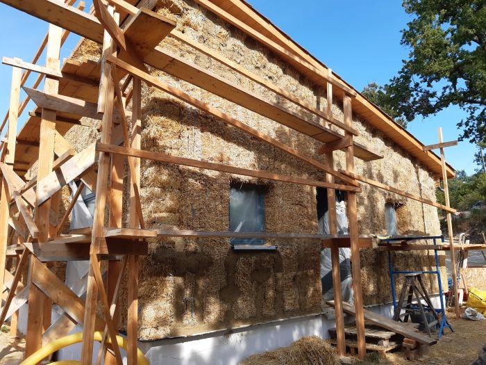 Nous souhaitons poursuivre cet élan d'entraide, partage et apprentissage collectif en proposant un chantier participatif pour la pose de bottes sur chant et les enduits extérieurs et intérieurs.