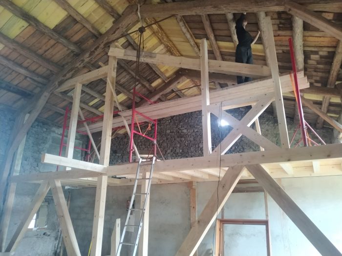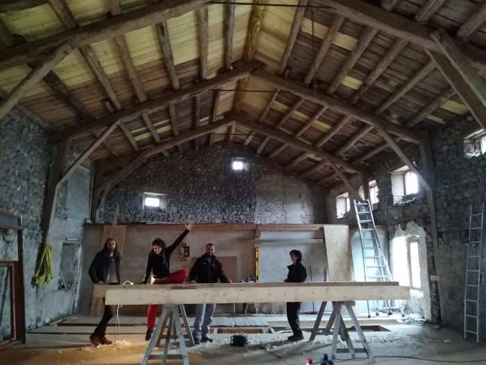 En mai-juin une charpentière qui a fait les compagnons et passé du temps à travailler au japon, construit la structure d’un mur d’environ 9m de long sur 4m de haut, qui permettra d’agrandir la partie habitable de la maison et de faire une salle de travail chauffée. Elle travaille en grande partie à la main, et le bois est local. Sa philosophie charpentière et de vie est très inspirante. Suite à son travail, il y aura une ossature en bois qui fera penser à une façade à colombages. Avant de mettre des géraniums nous souhaitons remplir la structure en terre/paille (méthode terre allégée), au cours d’un chantier encadré par Johnny Masse, maçon spécialisé en terre crue qui a l’habitude d'encadrer des chantiers collectifs et fait partie du réseau Twiza.