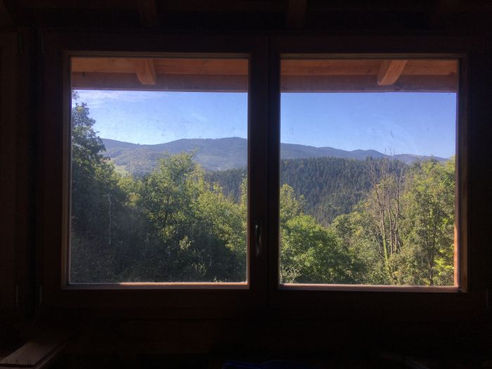- créé 4 magnifiques ouvertures pour les baies vitrées avec taille des seuils et montants en granit à la main, et linteau en arbres de notre forêt,