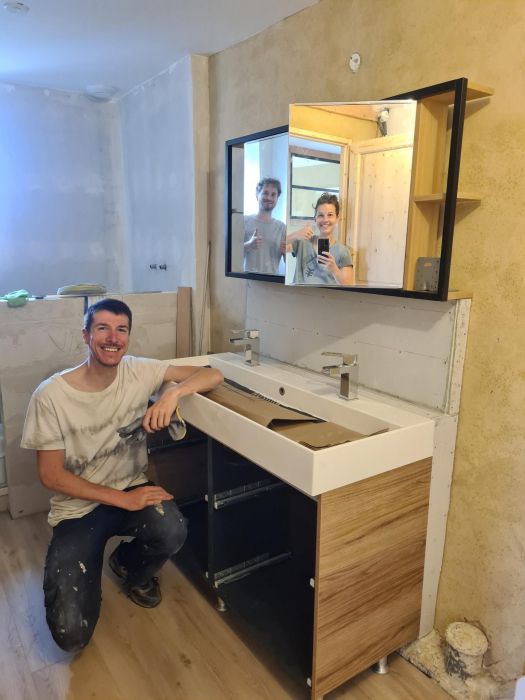 - Pose de la cuisine (récupérée sur Leboncoin) et des meubles de salle de bain