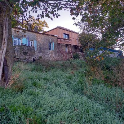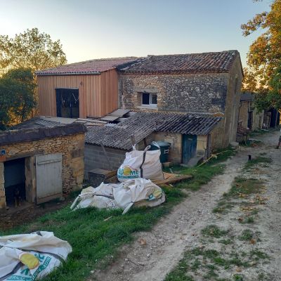 Nous sommes sur une ferme bio créée en 2024 par Eline et Julien : nous sommes maraîchers, éleveurs de brebis laitières dont nous transformons le lait, et de poules pondeuses. Julien habite déjà sur place, et moi, Eline, j’habiterai avec mon compagnon Jonathan, Charpentier et professionnel du bâtiment, dans une partie attenante qu’il faut rénover entièrement.