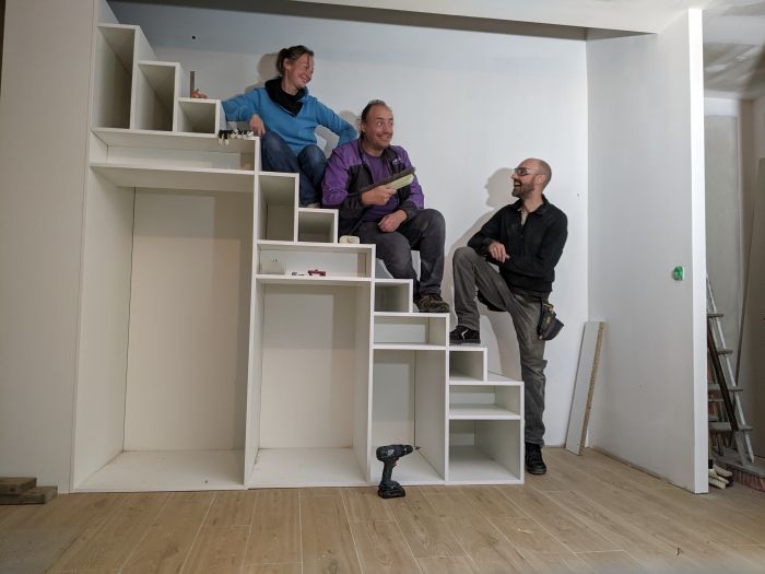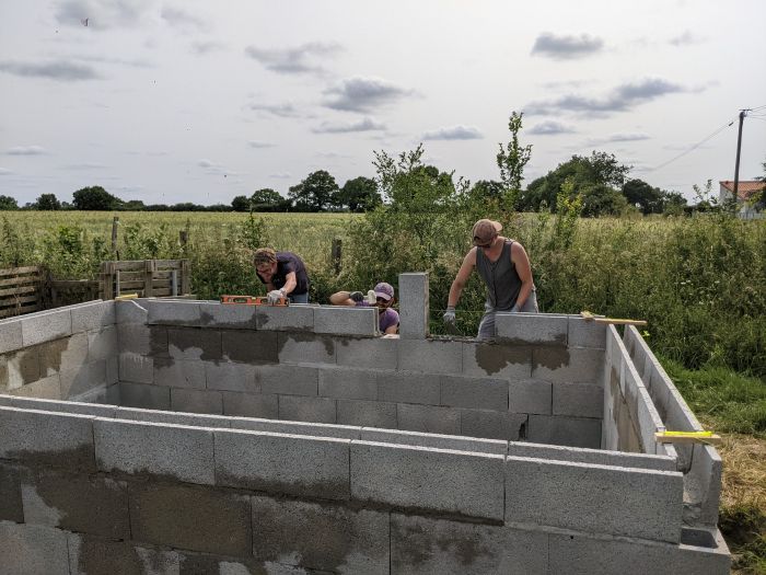 Maçonnerie (un peu de parpaings, muret en pierres, rejointement) ; Plomberie (installation de filtres et autres équipements, évacuations) ; Électricité (pose de la pieuvre...) ; pose de placo, rail cloison ; transformation d'un poulailler en serre ; démontage hangar métallique ; peinture à la chaux ; phytoépuration... et pas mal de projets bois (escalier, meubles...)
