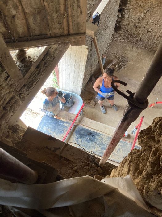Nous sommes au début de notre projet et tout reste à faire. Nous avons commencé par le curage de l’ouvrage (destruction des dalles bétons, dépose des enduits détériorés, etc.). Nous avons hâte de passer de la destruction à la construction.