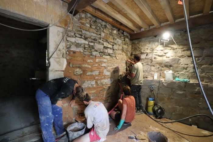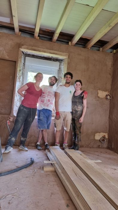 L’objectif de notre rénovation est d’en faire un maximum avec nos mains avec des matériaux durables (chaux / terre paille / pierre / bois). Qui plus est avec des matériaux locaux et même issus de notre terrain si possible ! La bâtisse étant très haute (+ de 20 mètres entre le faîtage et le sol), nous avons choisi de faire venir un artisan pour refaire la toiture. Nous bénéficions de l'accompagnement d'une association de restauration et valorisation des moulins du Béarn ainsi que du soutien d'un artisan qui travaille de manière traditionnelle. Pour les enduits intérieurs, Lise fait partie d'une association de terre-pailleux qui nous accompagnera sur ce poste en 2022.