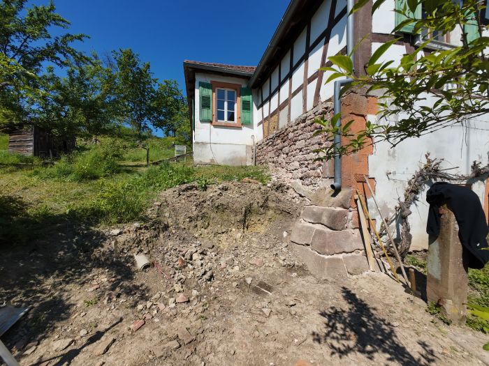 Récemment installé.es dans une maison à pans de bois dont les dernières rénovations datent des années 90 et ne l’ont pas mise en valeur (à notre goût), nous sommes deux artisan.es du bâti ancien. C’est d’ailleurs aussi pour ça que nous avons choisi ce lieu et ce projet. Notre activité de maçonnerie de terre crue a orienté des choix de matériaux :)