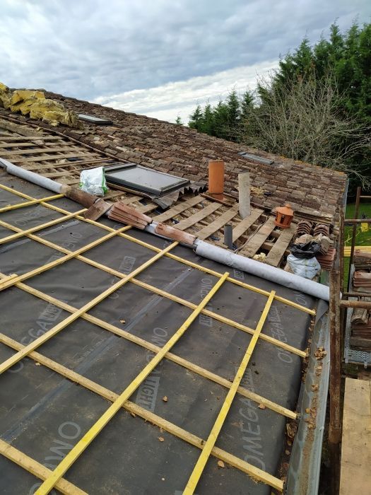 > voligeage, pose pare-pluie, contre liteaux, liteaux, tuiles, remise à niveau et jointoiement velux, cheminée aérations, closoir faîtage et arêtier, compléter la maçonnerie de la génoise.