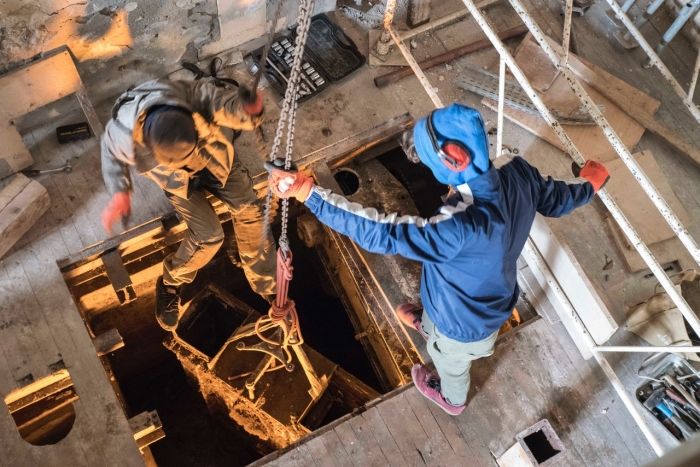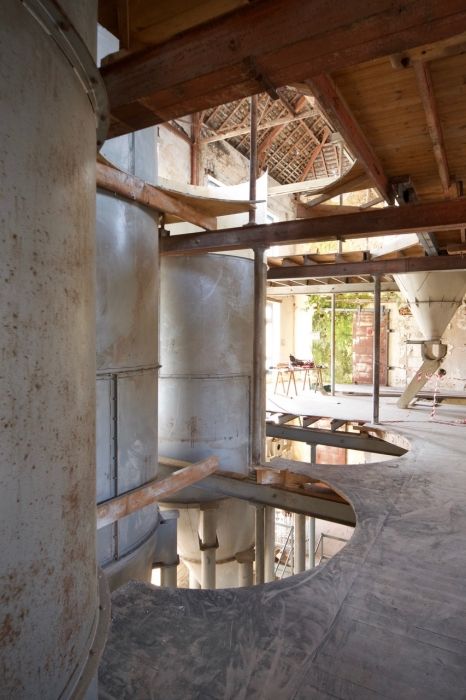 - Démontage des anciennes machines occupants encore certains espaces du bâtiment. Ces machines, qui servaient au transport et à l'ensachage de la farine, se présentent sous la forme d'une gigantesque colonne peuplée de machines diverses traversant 4 étages.