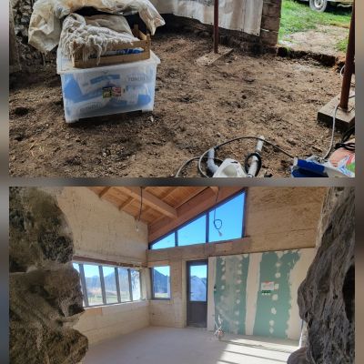 Puis faire des murs en pierre (aussi celles qui servaient de dallage) pour boucher des ouvertures. J'ai de l'expérience dans ce domaine pour avoir fait les murs de clôture de la maison, et j'ai aussi ma bétonnière.