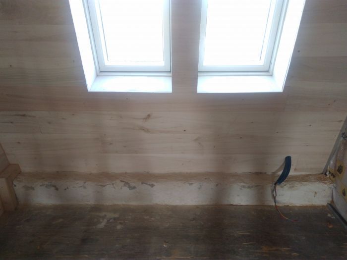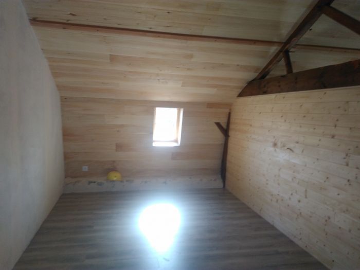 En juillet un professionnel sera présent dans le grenier pour réaliser une isolation écolo en laine de bois croisée, et tout en l'aidant, il enseigne son savoir faire et pose de lambris en peuplier au plafond.