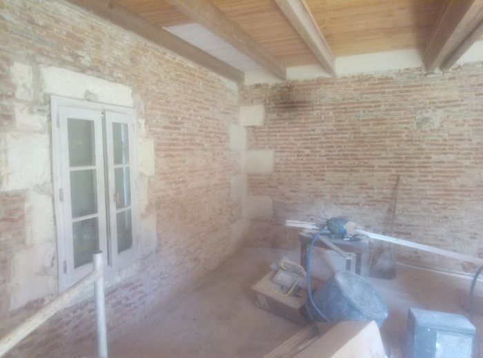 - destruction de l'enduit intérieur en ciment et remplacement par l'enduit sable/terre/paille/chaux finition