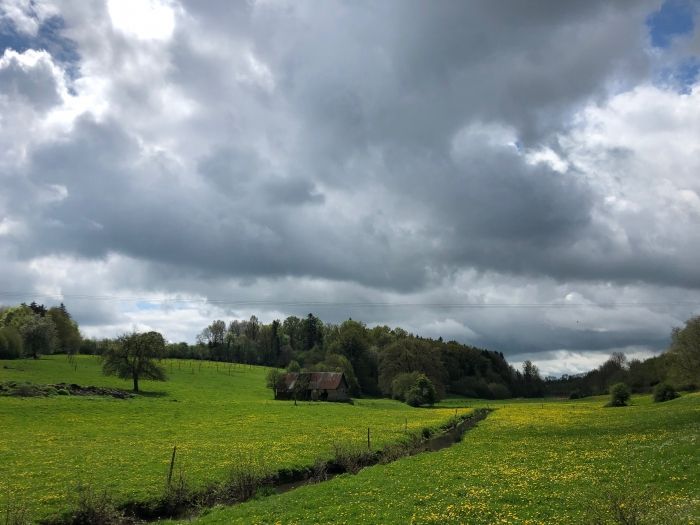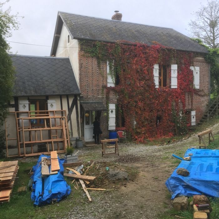 La maison est située en bordure d'un petit village du pays d'Auge, à 50 mn des côtes normandes. Cadre de chantier très agréable ! Nombreuses balades dans les environs.