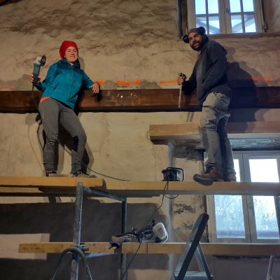 Nous avons enlevé tout le ciment du sol au plafond qui étouffait les murs en pierre ainsi que les pièces de bois des étages abimées.