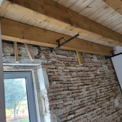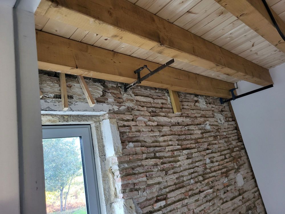 La maison a presque 200 ans et était en très mauvais état. Nous avons tout démonté, élément par élément, en récupérant tout ce que nous pouvions, et avons gardé uniquement les murs périphériques en briquettes de terre cuite pleines.