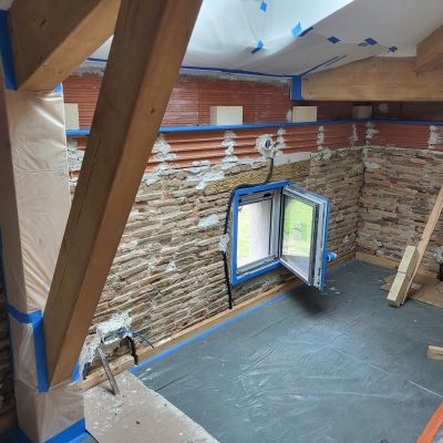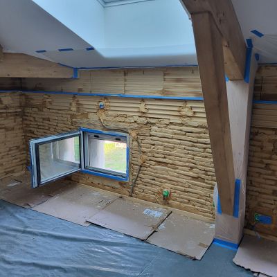 - Isolation sous rampant entre chevrons en laine de bois Steico fabriquée dans le Lot-et-Garonne et frein-vapeur