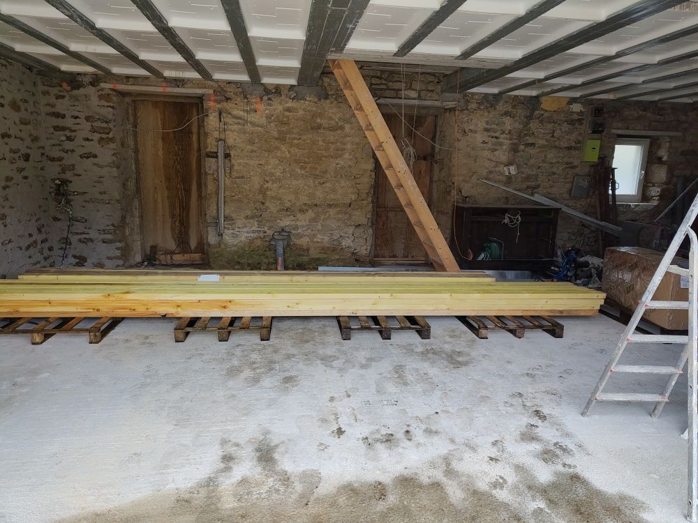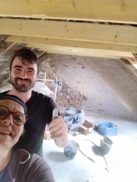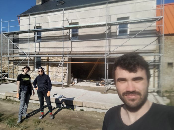 -> Pour le moment, nous sommes principalement sur la maison (enduit chaux intérieur et extérieur puis isolation et bardage puis pose véranda) et un peu sur le hangar (fondation : terrassement, semelle filante, mur de parpaing, remblais, coulage de dalle).