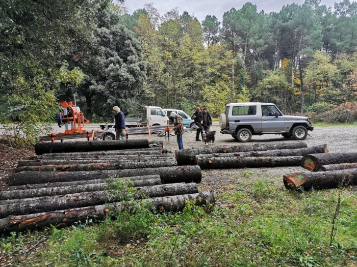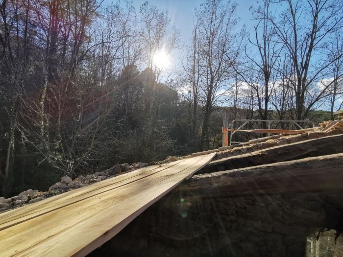 * Démonter la charpente (descendre le bois), le trier, et remonter le bois d'œuvre (il a été pris sur le terrain et scié non loin, il est stocké sur place)