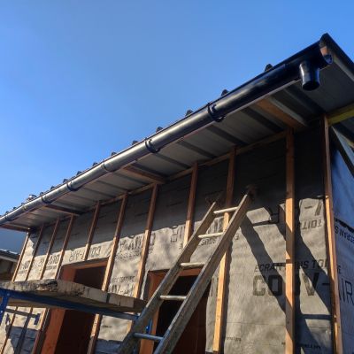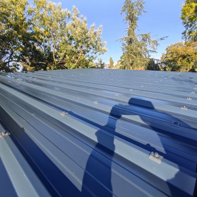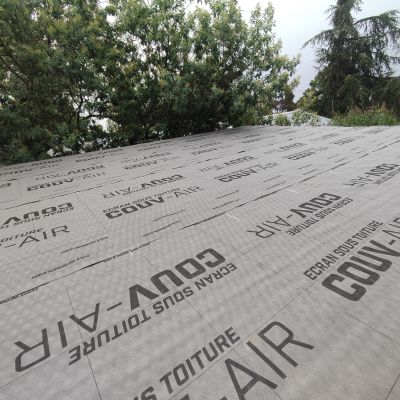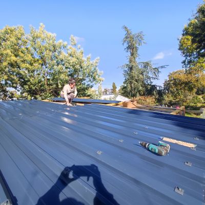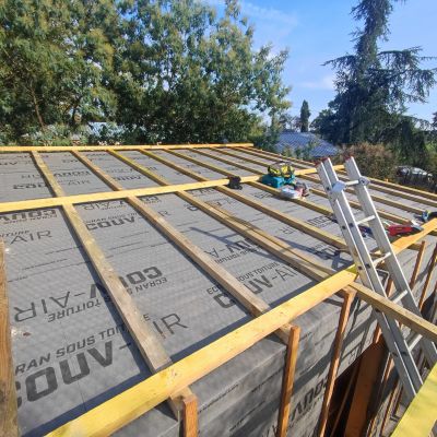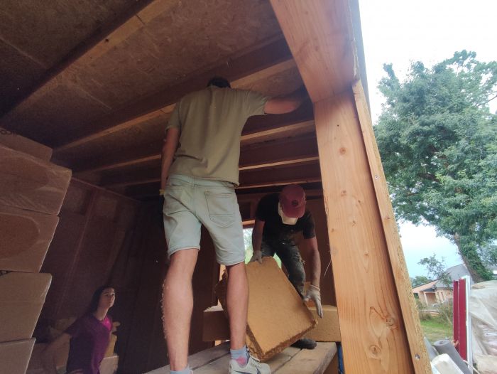 Nous avons opté pour la technique de l'ossature bois pour les murs anciennement en parpaing que nous avons fait tomber et reconstruis, et une isolation en laine de bois et panneaux isolants bois. Côté toiture on a remis la tôle initiale (l’idée du réemploi et de la récup’ est importante pour nous, au-delà de la question financière mais aussi par principe éthique).