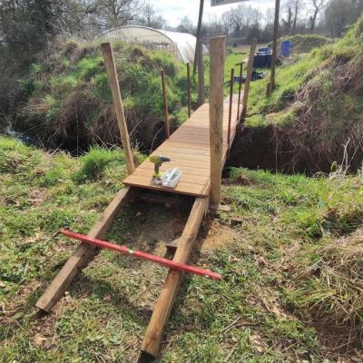 En parallèle il y a toujours des petits chantiers en cours : transformation d’un bâtiment un peu fatigué en une mini-serre pour gérer les semis / Isolation et renforcement d’un mur du poulailler en terre-paille / création de toilettes et douches extérieures et bois, terre et paille... et un peu d’aide au potager n'est jamais de refus… Il n’y a pas de quoi s’ennuyer !