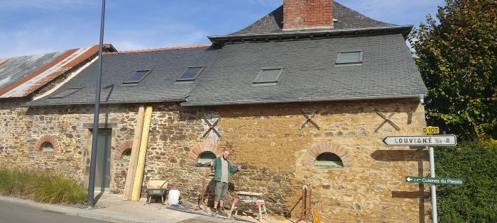 Là, il s’agit d’un chantier de jointoyage d’une façade de la longère de grange. Elle est longue (38 mètres linéaires !), mais heureusement pas trop haute. Je compte le faire pendant le mois d’octobre. Pas de ciment : de la chaux, et un peu d’argile pour teinter. Il y a quelques années, avec Bérénice nous avions suivi tout un cycle de formation sur les enduits avec l’association Tiez Breiz (préservation du bâti ancien), et nous avons déjà pas mal jointoyé, notamment dans notre chantier précédent. Bref Bérénice sait faire de très jolis jointoiements, et à nous deux on a pas mal d’expérience.