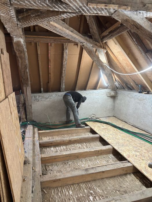 - Pose d’un sur-solivage dans les combles + isolation en ouate de cellulose insufflée