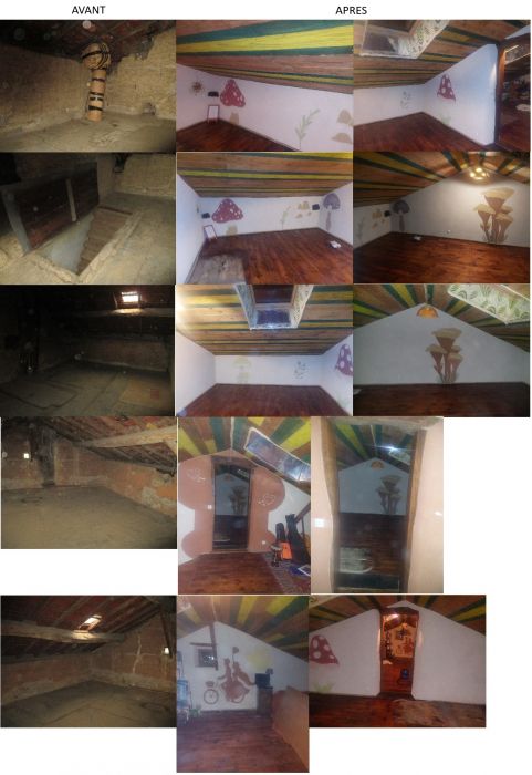 Samedis 24 et 31 janvier puis samedis 7, 14, 21 et 28 février : décroutage d'un mur, démontage de cloison, démontage d'un viel escalier en bois, solivage de raccord et raccord de plancher.