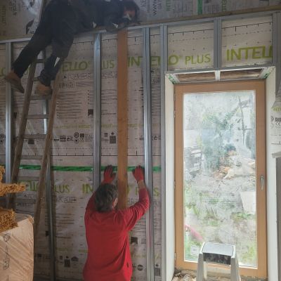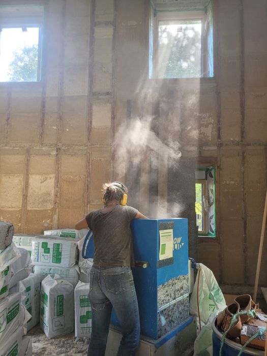 Dans un second temps : construction d'un étage avec la méthode GREB (ossature bois et remplissage paille), construction d'une nouvelle charpente et couverture en ardoises, pose de nouvelles menuiseries…