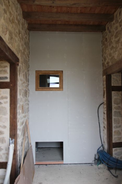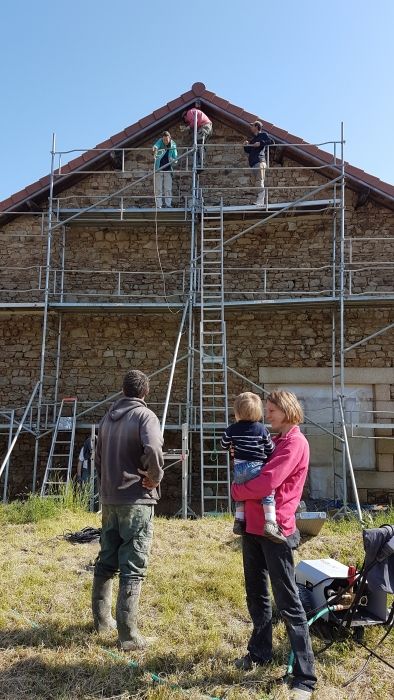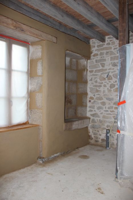 On s'est ensuite attelé au gros œuvre pour tout ce qui concerne le rdc : décaissemen, hérisson, dalle chaux, plancher chauffant, projection chaux-chanvre, montage de cloisons ossature bois et plaques de fermacell, réfaction des joints d'une façade. Puis on a attaqué les finitions : enduits chaux et terre, tomettes et plinthes en terre cuite.
