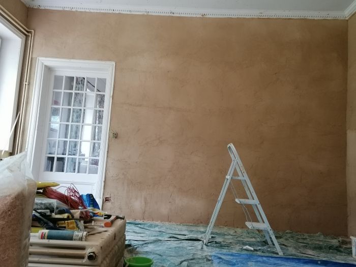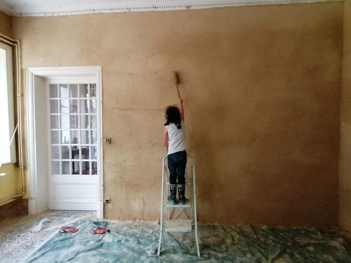 L'objectif est de rénover des pièces dont les murs ont été enduits de ciment et de revenir à des enduits historiques, en terre.