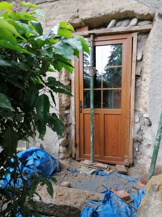 Au programme, piquage des murs intérieurs et extérieurs, enduits, ouverture d'une porte + finitions, création d'un drain pour terrasse, réfection d'une marche extérieure.