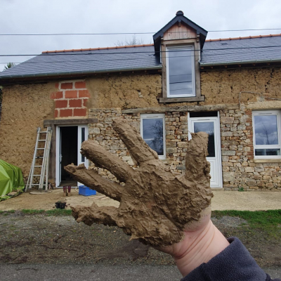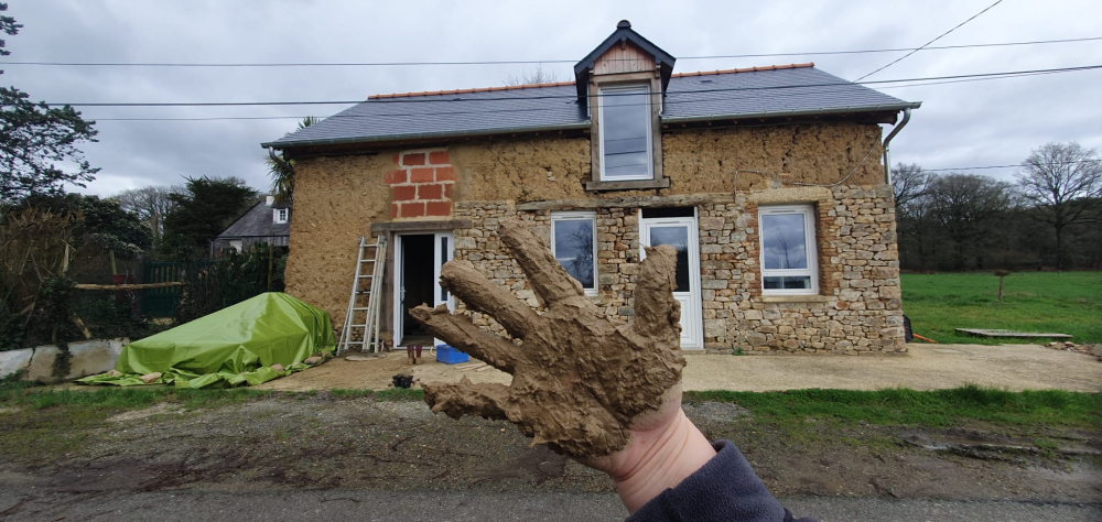 - Réfection des murs en bauge (argile) : application d'un "correcteur thermique" (terre-chanvre) et d'enduits de finition