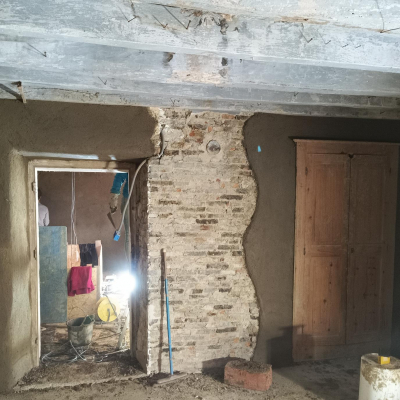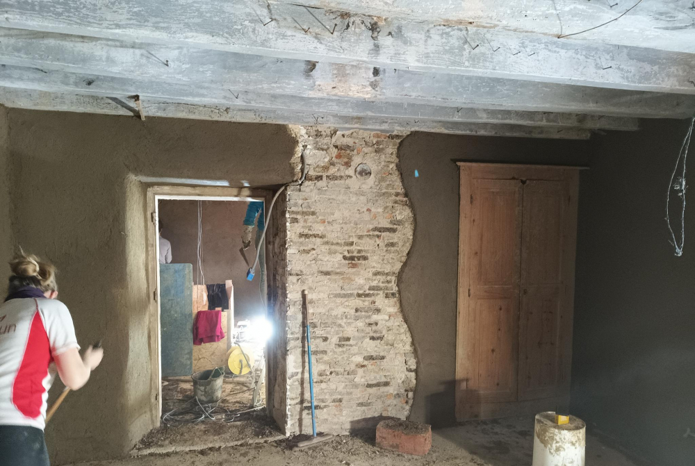 En septembre nous allons faire les enduits en terre-paille sur les murs de la maison accompagné par Johnny Massé formateur et artisan maçon.