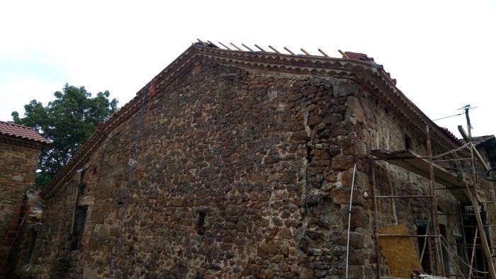 Les murs en pierres sont conservés et tout le reste est à faire (charpente (bois et poutres coupées par mes soin ;) couverture, planché, isolation (watt de cellulose), plomberie, électricité, joint pierres, etc…)