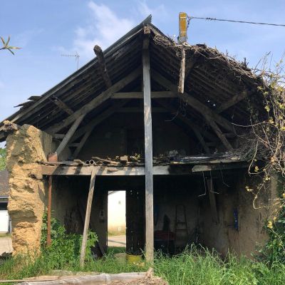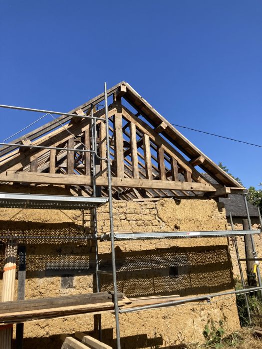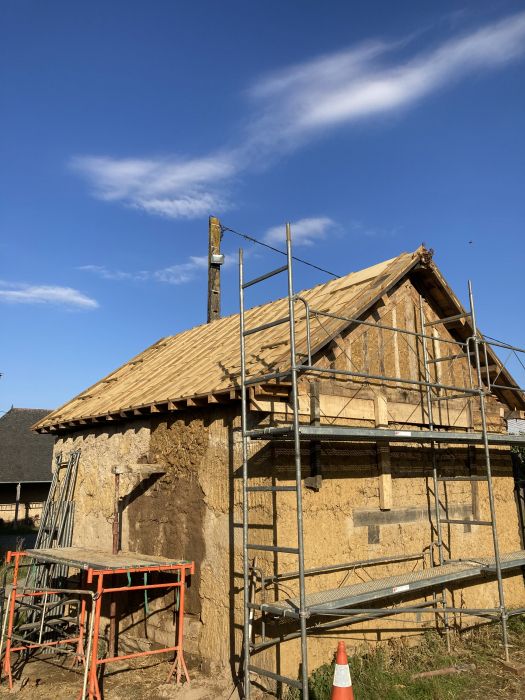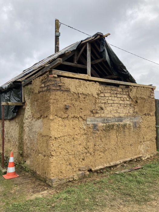 Avant la réhabilitation de la longère puis l’aménagement de l’ancienne étable, la restauration du fournil est urgente. Ayant subi le plus durement les intempéries de son siècle, il presse de le placer hors d'eau et d'air. Après avoir produit le mélange terre-paille nous avons pu faire les levées au fil des semaines.