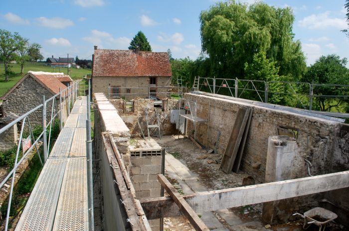 Maçonnerie : Pierres et briques hourdées à la terre. Reprise partielle, mise en places de tirants, création d'ouvertures, remplacement de linteaux, rejointoiement, enduits chaux et/ou enduits Terre.