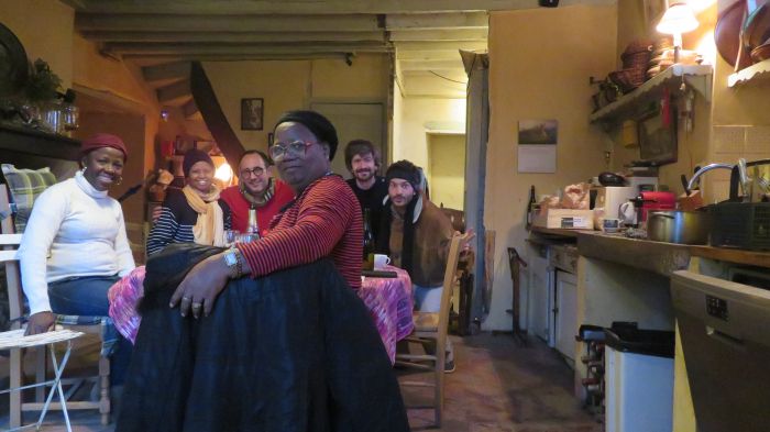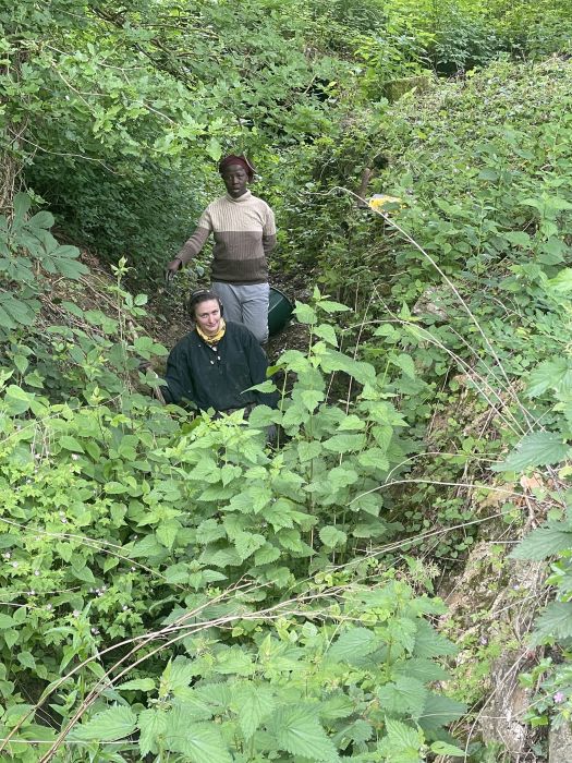 En avril 2021, Nadège, une jeune artiste en dessein et peinture, est venue réactiver le chantier en décorant les tuyaux d’évacuation des eaux. Le chantier s’est poursuivi pendant l’été 2021 avec Nadège et son amie Laura, Alister, et Matthieu avec qui nous avons décoré les tuyaux d’évacuation et recreusé les fossés. Une source et une canalisation ancienne ont été découvertes à cette occasion. Au début de l’hiver, un autre bénévole du réseau Twiza est venu pour aider à dégager à la cave le début de souterrain par lequel circule la canalisation. Le chantier est réouvert depuis le 1er juin 2022. Avec Robin, nous avons commencé à dégager une canalisation ancienne située au fond du fossé, faite de tubes de ciment et de joints à base de mâchefer. Nous avons aussi posé deux buses pour laisser passer les eaux de ruissellement et établir un passage au-dessus du réseau de fossés. Puis nous avons réunifié les deux anciens bassins à l’aide d’une pelleteuse pour permettre l’écoulement des eaux. L’entretien des abords des fossés s’est fait à la fin du mois d’octobre avec Youssef qui a coupé des arbustes et des végétaux.