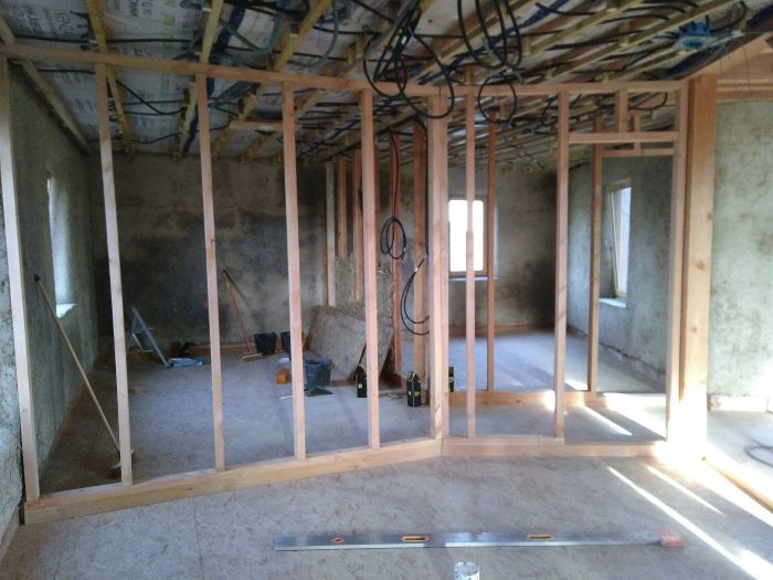 Depuis l’été dernier, entre le boulot et les contraintes liées au contexte, on a avancé lentement mais sûrement : toute la paille a été mise dans les murs, la moitié du bardage environ a été réalisée, l’isolation sous toiture a été finalement réalisée avec de la laine de bois (on en a profité pour isoler le garage avec les chutes), les menuiseries ont été posées. Les finitions des murs en paille en vue de les préparer pour les enduits sont en bonne voie (poupées à faire et à poser, fils à retendre, rotofil à passer, trous à boucher, etc..). D’ici à cet été on prévoie de faire une bonne partie de l’étanchéité à l’air, la structure des cloisons, l’électricité et la suite du bardage…si tout va bien !