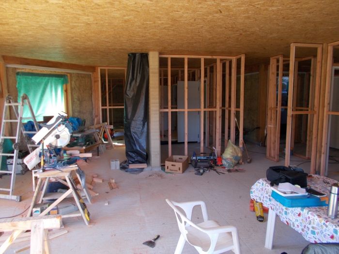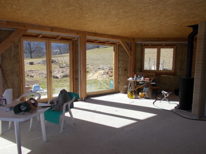 Depuis deux ans, nous construisons notre maison bois et paille : ossature poteau-poutre traditionnelle et des murs paille excentrés à cette ossature, bâtis comme de la paille porteuse.