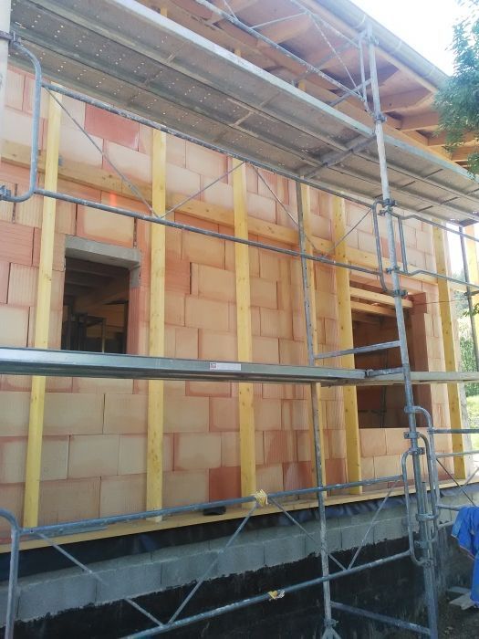 La maison est hors d'eau, c'est le moment d'isoler la brique par l'extérieur, avec des bottes de paille posées sur chant. L'ossature bois est prête à recevoir la paille. Le système est semblable au système poteaux-poutres traditionnel. Les bottes sont posées sur chant. L'ajout d'un mur intérieur en briques apportera une grande inertie à l'habitat.