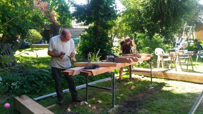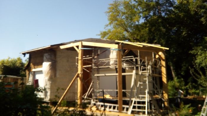 Un chantier pour venir apprendre la taille et la pose de la charpente tradi pour l'extension de la toiture de la maison paille en cours de travaux.