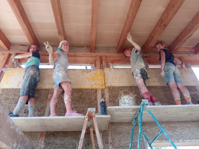 Pour ces travaux, l’installation du mélange paille-argile dans les murs, les enduits à la boue et ceux à la chaux, la réalisation des sols, ainsi que les différents travaux de menuiserie nécessaire tout le temps, nous recherchons des bénévoles !