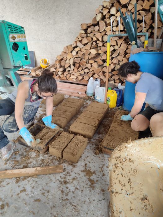 Il concerne l’isolation d’une chambre en terre-chanvre banchée derrière une natte de roseaux sur ossature bois qui sera enduite 1 mois après (toujours en terre) pour une question de séchage et la réparation d’un mur de clôture en pisé à l’extérieur avec des poses d’adobes de terre crue pour boucher un trou, que nous aurons préalablement fabriquées sur place le jour du banchage.